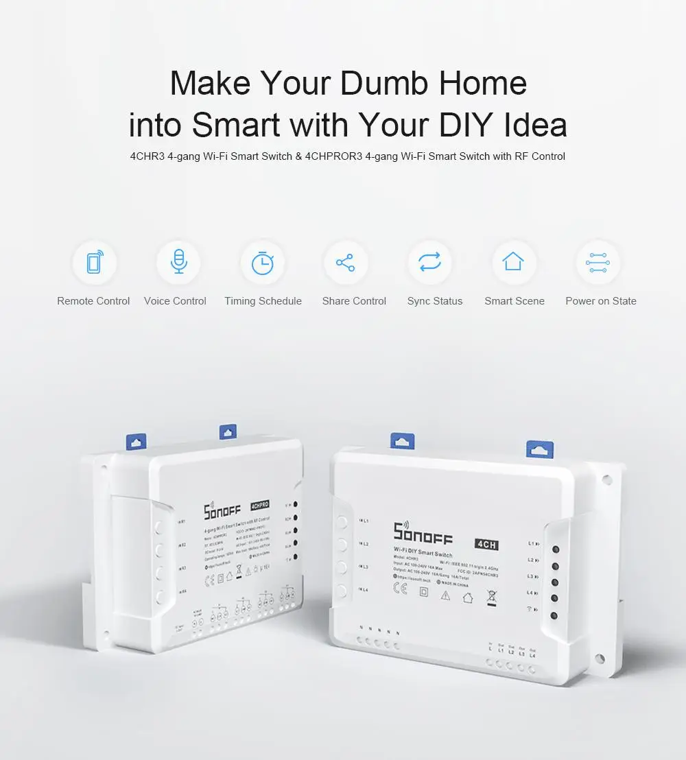 SONOFF 4CHR3 & 4CHPROR3 are both 4-gang DIY Wi-Fi Smart Switches designed to give you the ability to integrate smart control into your existing home to enable a smart home. Each smart switch has 4 gangs that can be used to control lights and other home appliances at the same time in four areas of your home. There is a major difference between 4CHR3 and 4CHPROR3, which is 4CHPROR3 is designed with an additional function for RF control. The function is purposely adopted to make you turn on/off the device connected with 4CHPROR3 via the SONOFF RM433 remote controller.